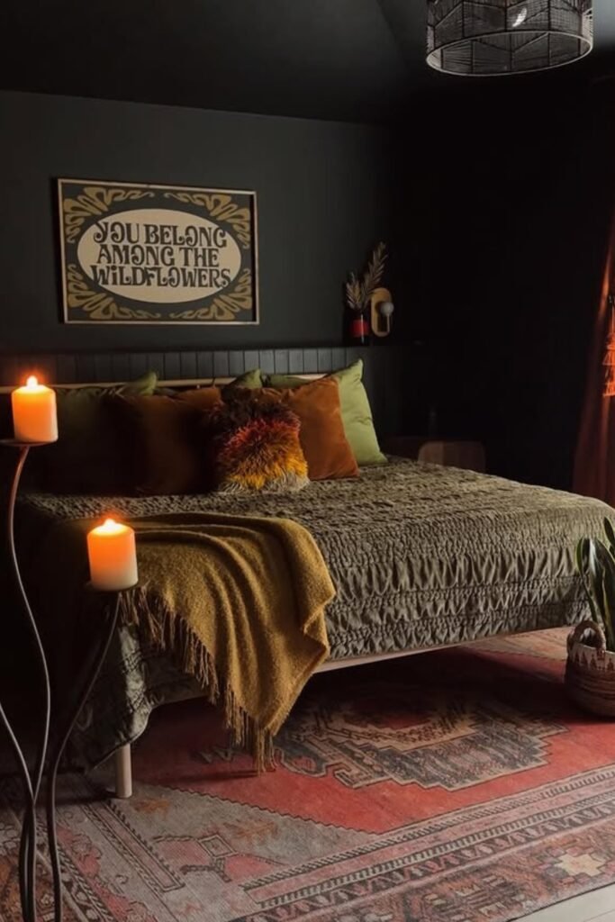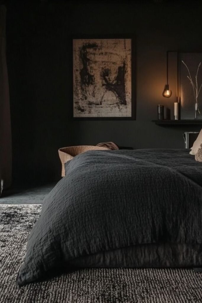 You can begin with just one dark wall, then balance it with light bedding, layered textures, and warm lamps.