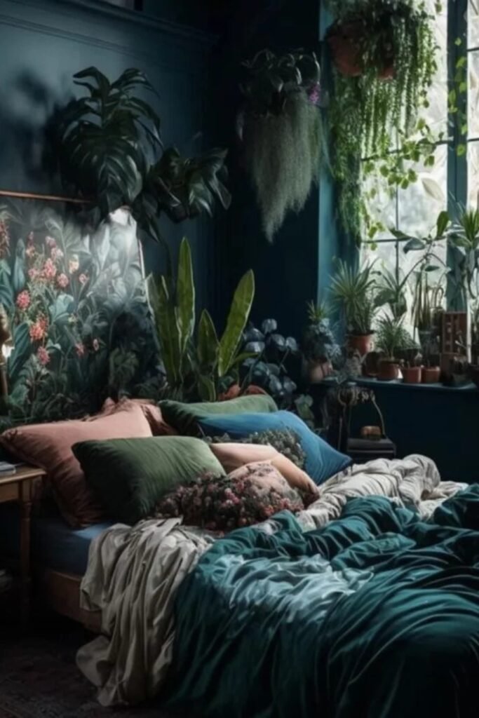 You should keep walls deep and moody, then layer greenery at different heights. You can mix real plants with darker textiles so your bedroom feels thoughtful, not like a greenhouse.