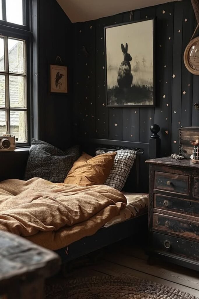 You should keep the wall color deep and matte, add subtle patterns or decals sparingly, and then you can ground the look with warm bedding and worn wood furniture.