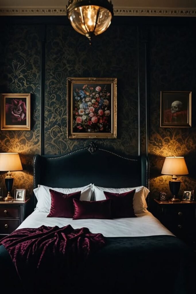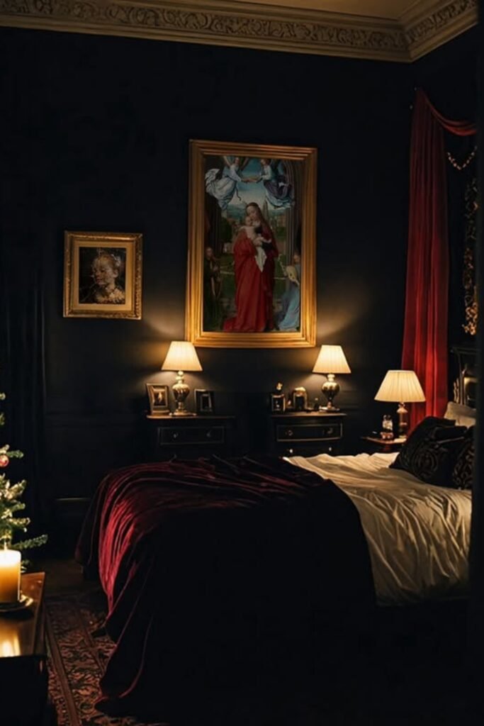 You can start with dark walls, add one bold textile color like burgundy or wine, and keep your lighting soft and symmetrical so your bedroom feels grounded, not overpowering.
