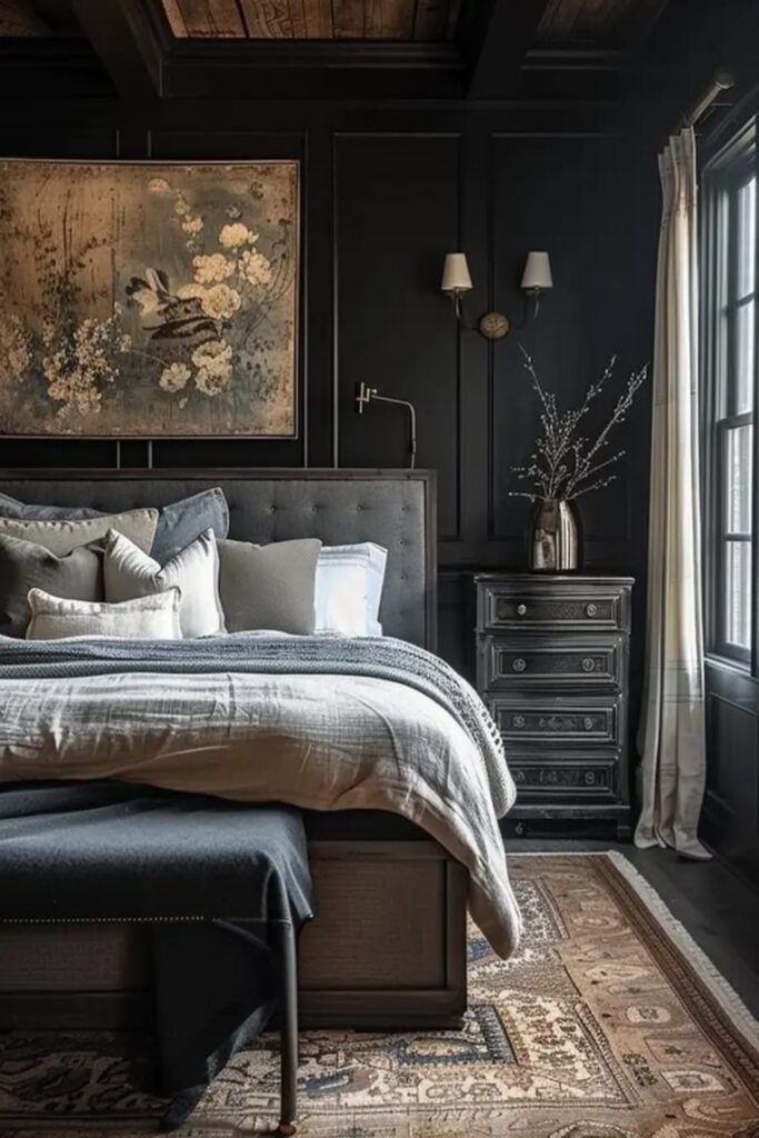 If you want your bedroom to feel elegant instead of busy, you can go for clean dark walls, soft lighting, and one strong artwork.