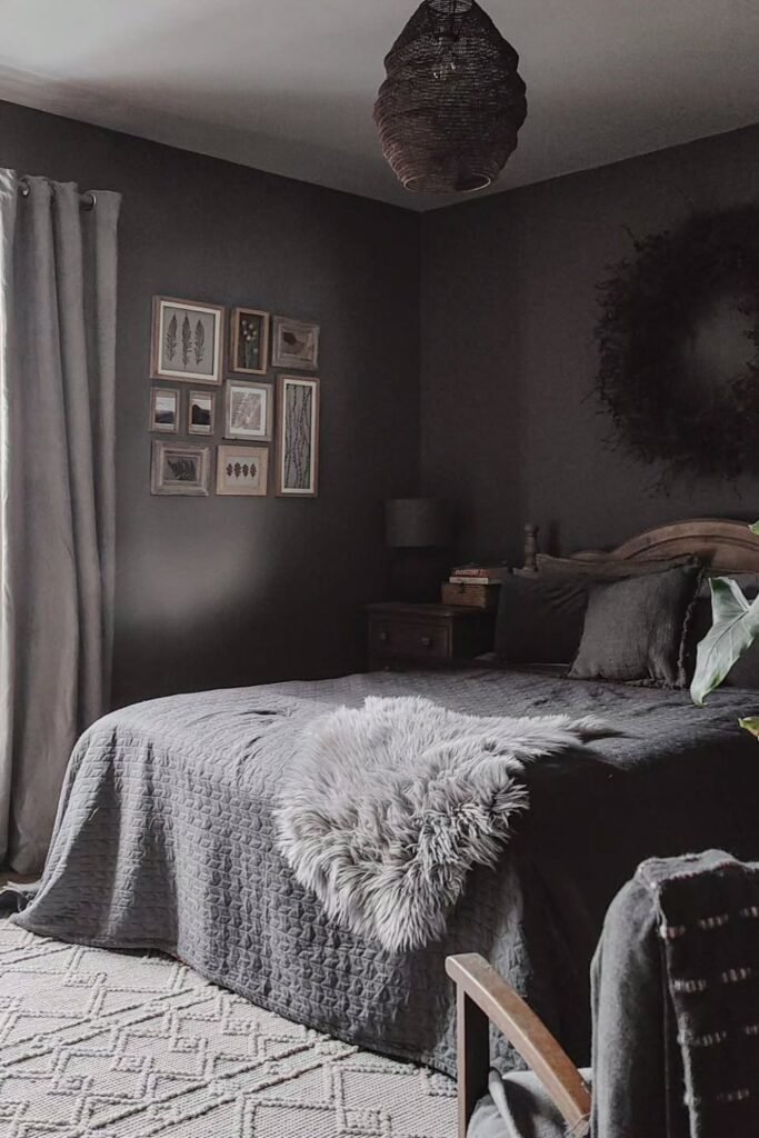 If you want your bedroom to feel grounded without heaviness, you can pair dark walls with light bedding.