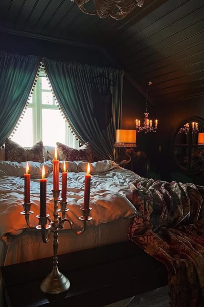 If you love slowing down at night, you can build a bedroom around the feeling of night itself, low light, heavy fabrics, and rich colors.