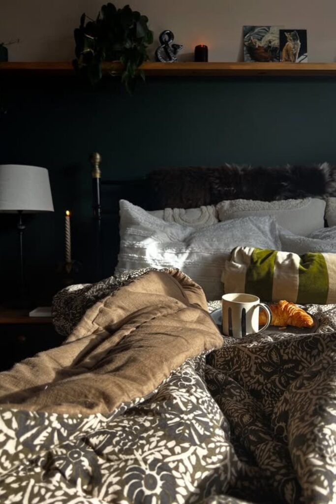 If you want your bedroom to feel calm and grounded, you can start with a deep green wall behind your bed, it sets the tone without needing heavy decor.