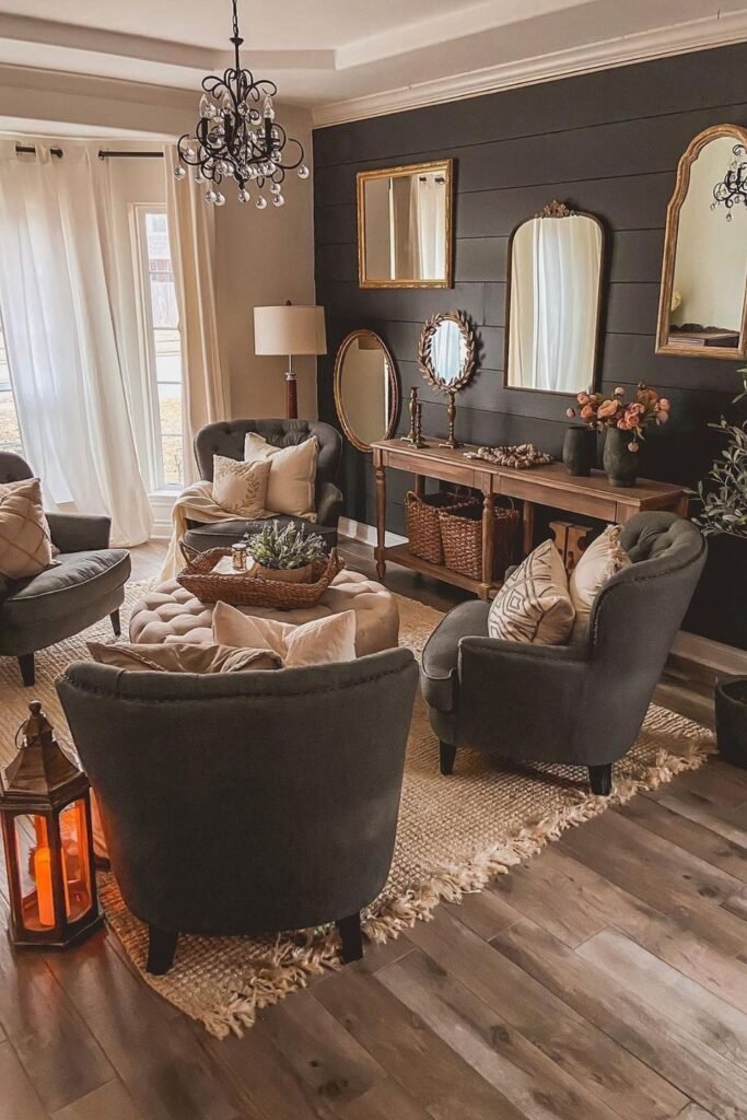 You can transform your living room into a cozy, dramatic retreat with dark shiplap walls.