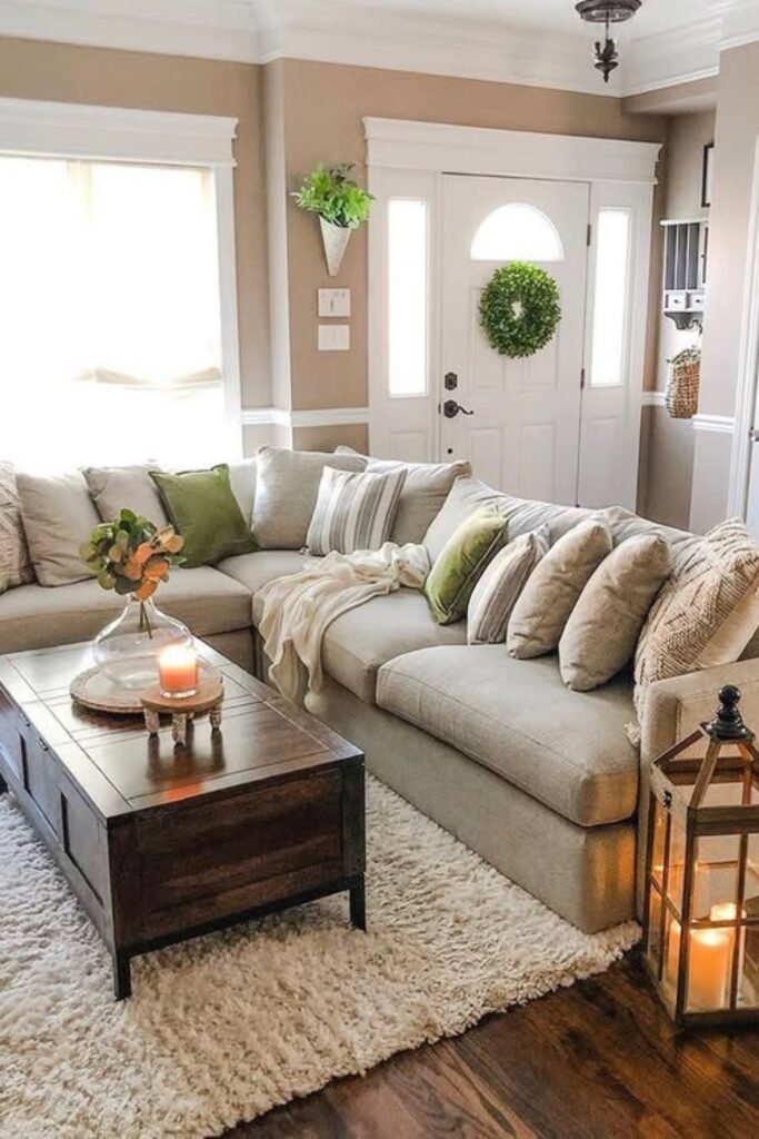 You can use a neutral sofa, add textured pillows, layer a plush rug, and bring in a touch of green for life and warmth.