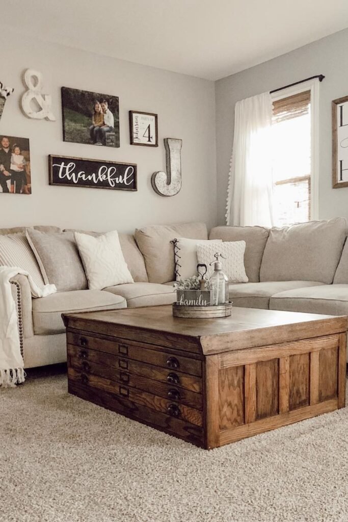 The large sectional keeps it practical for real life, while neutral tones and a sturdy wood coffee table ground the look.