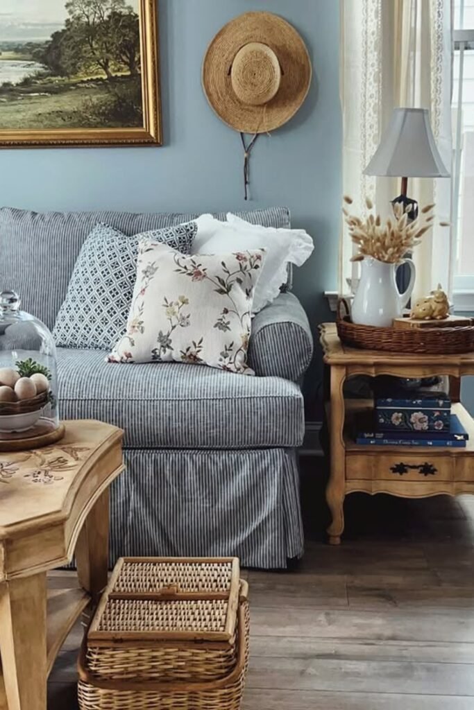 You can layer a striped sofa with floral pillows and woven accents to mix comfort with vintage charm.