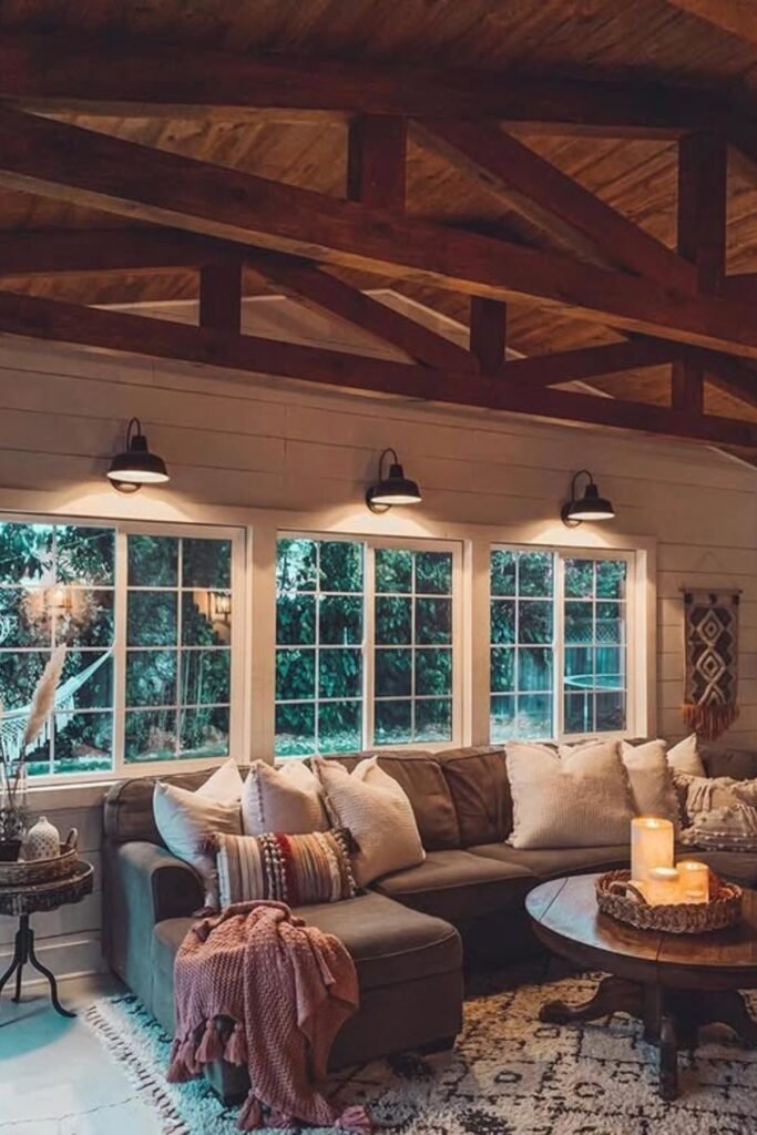 You can create a cabin-like glow in your living room by highlighting exposed wooden beams and soft candlelight.