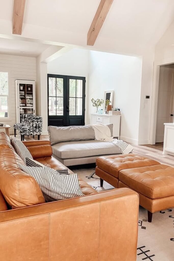 You can instantly ground your bright farmhouse living room with tan leather, which adds warmth against crisp white walls and ceilings.