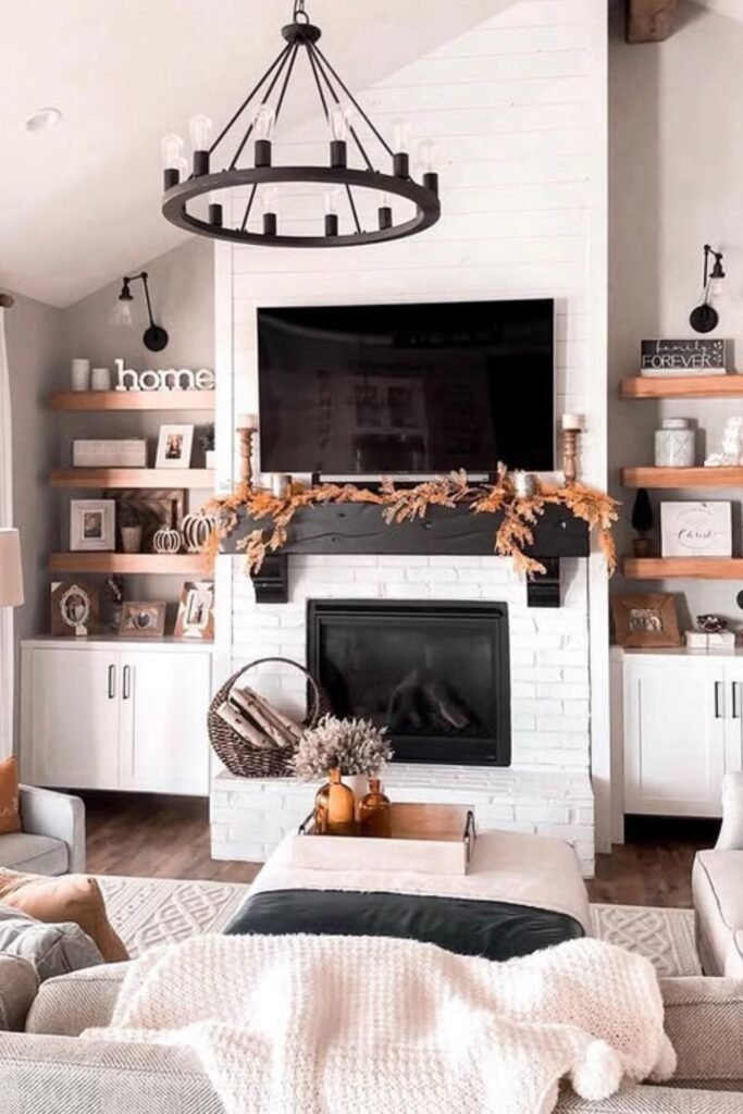 A white shiplap fireplace surrounded by floating wood shelves gives this farmhouse living room its cozy, layered character.