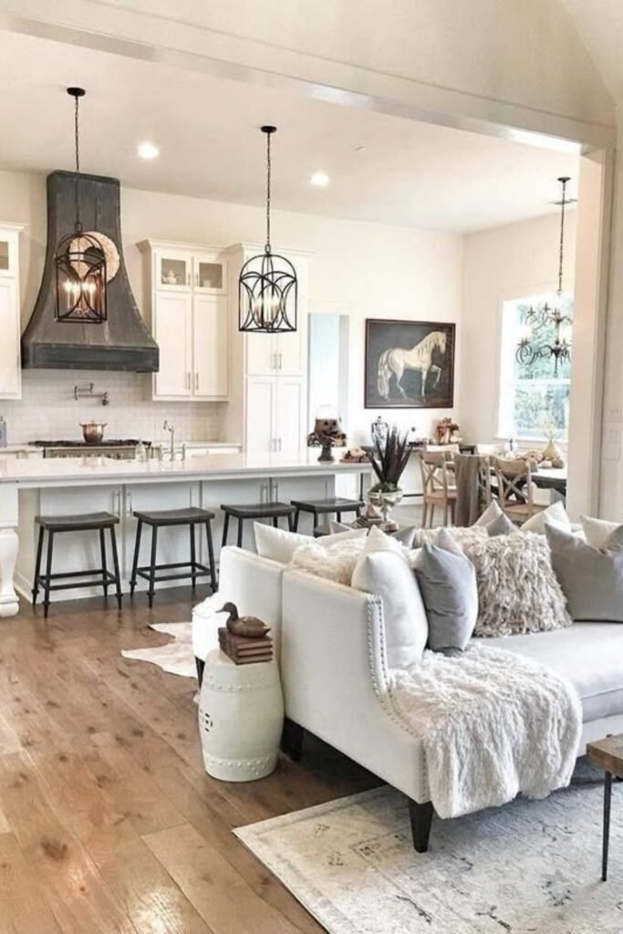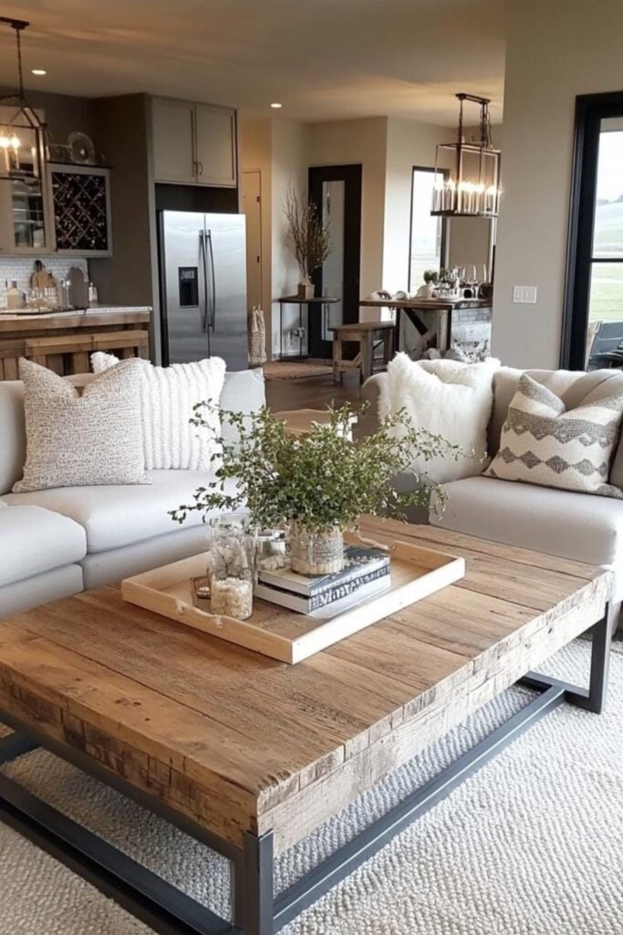 You can bring clean lines and rustic warmth together in your open farmhouse living room.