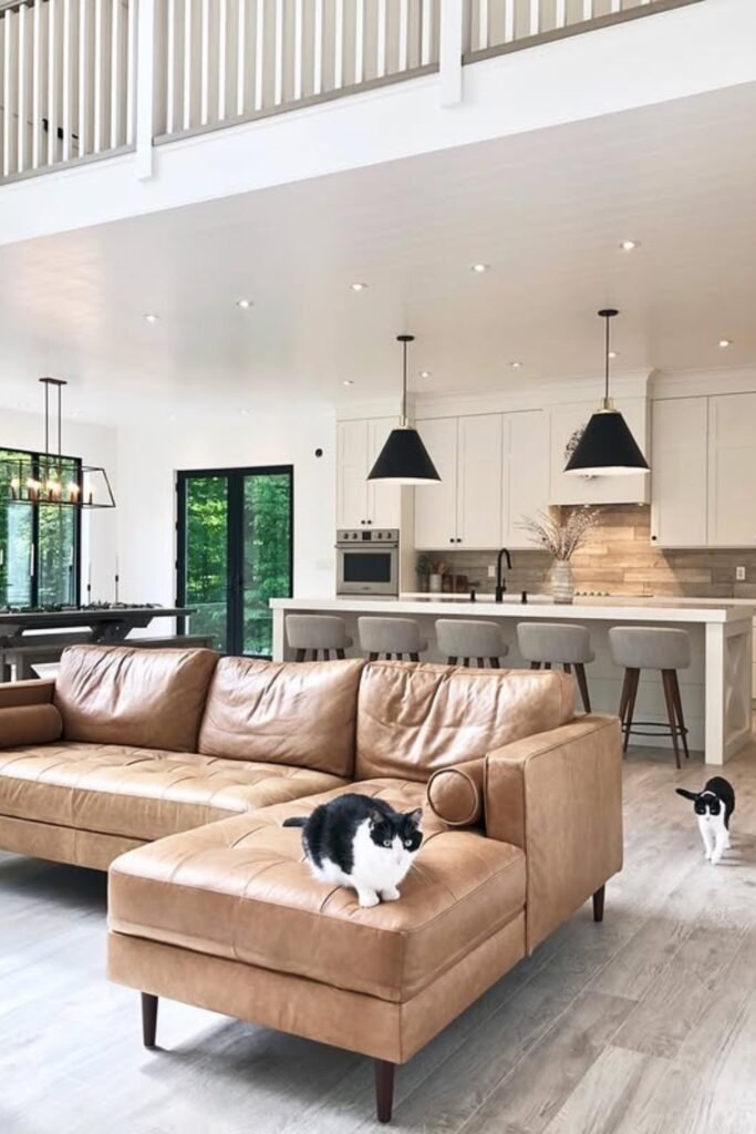 A tan leather sofa adds coziness to bright white walls, while black fixtures and hardware give you a modern edge.