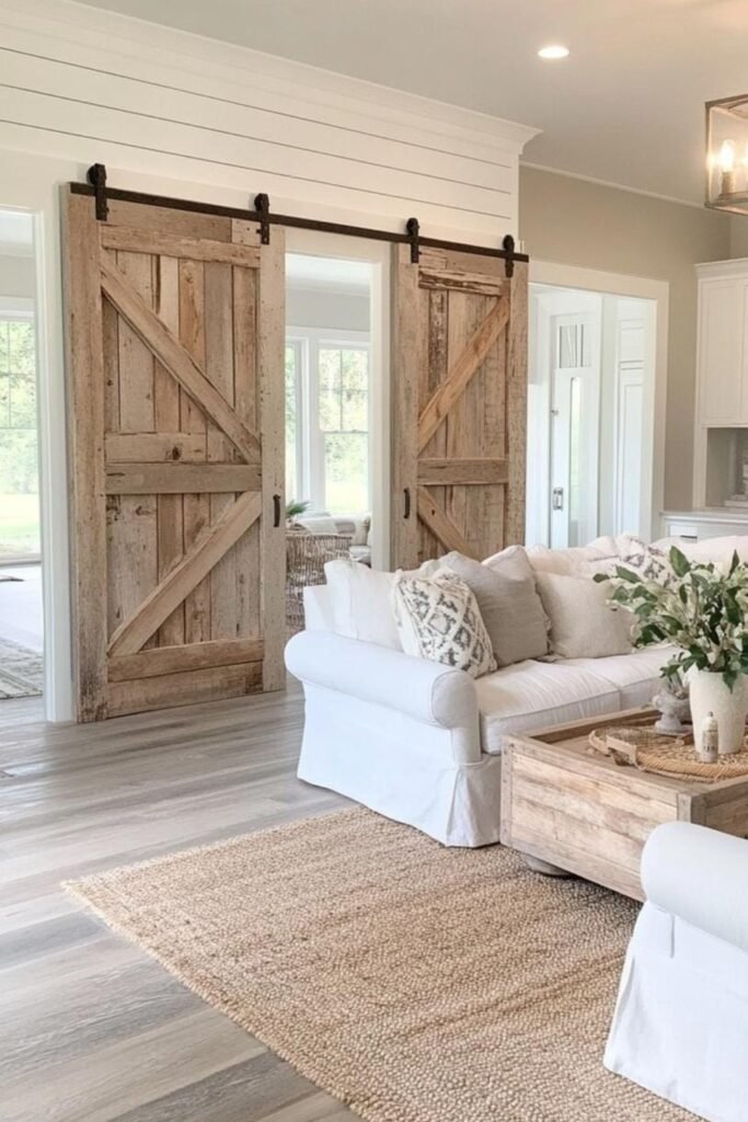 You can instantly anchor your living room with reclaimed wood barn doors, giving it rustic character.