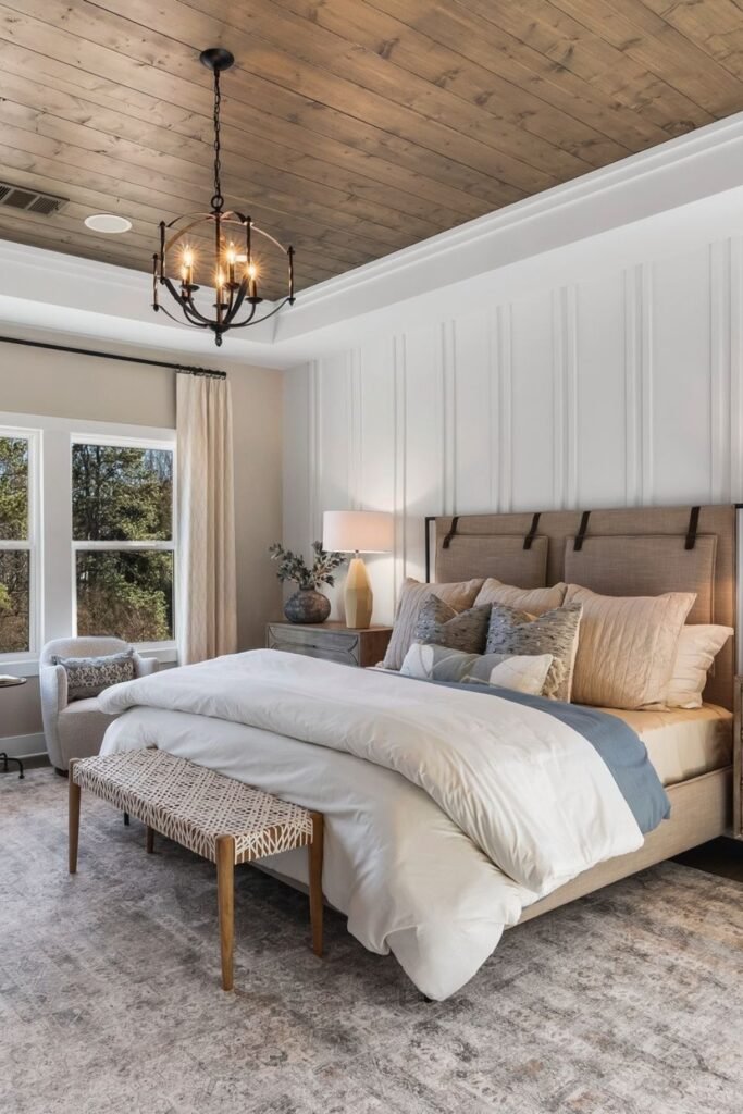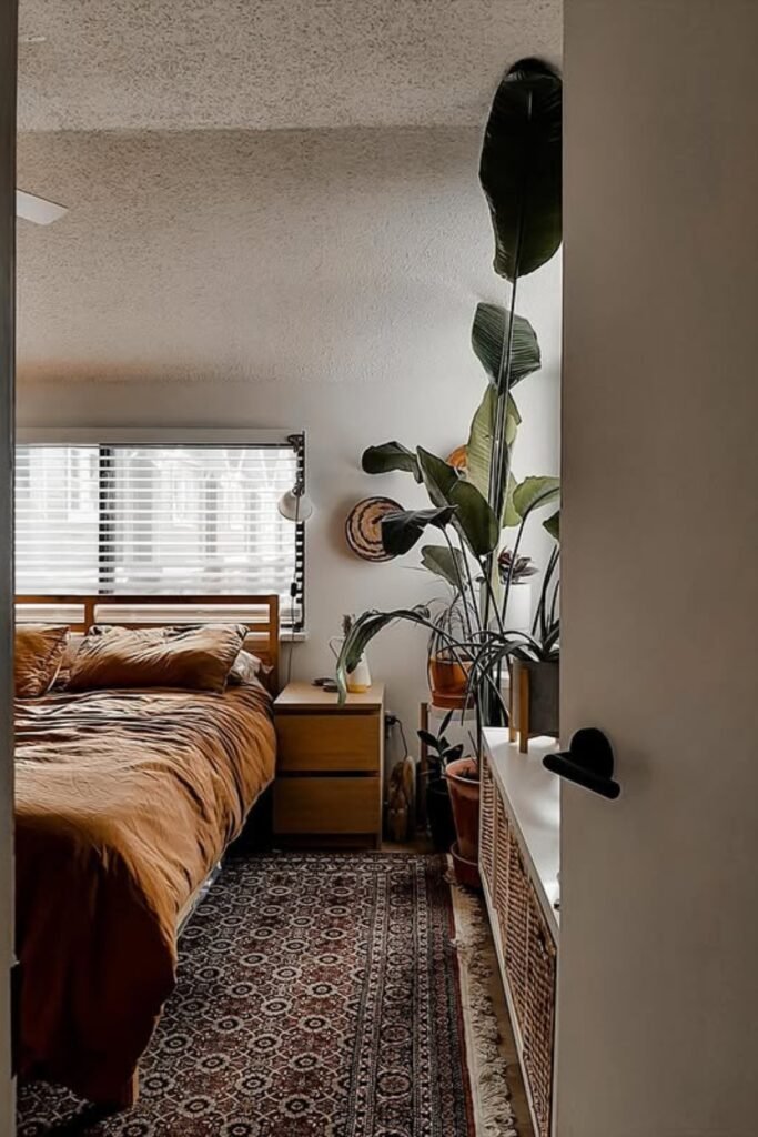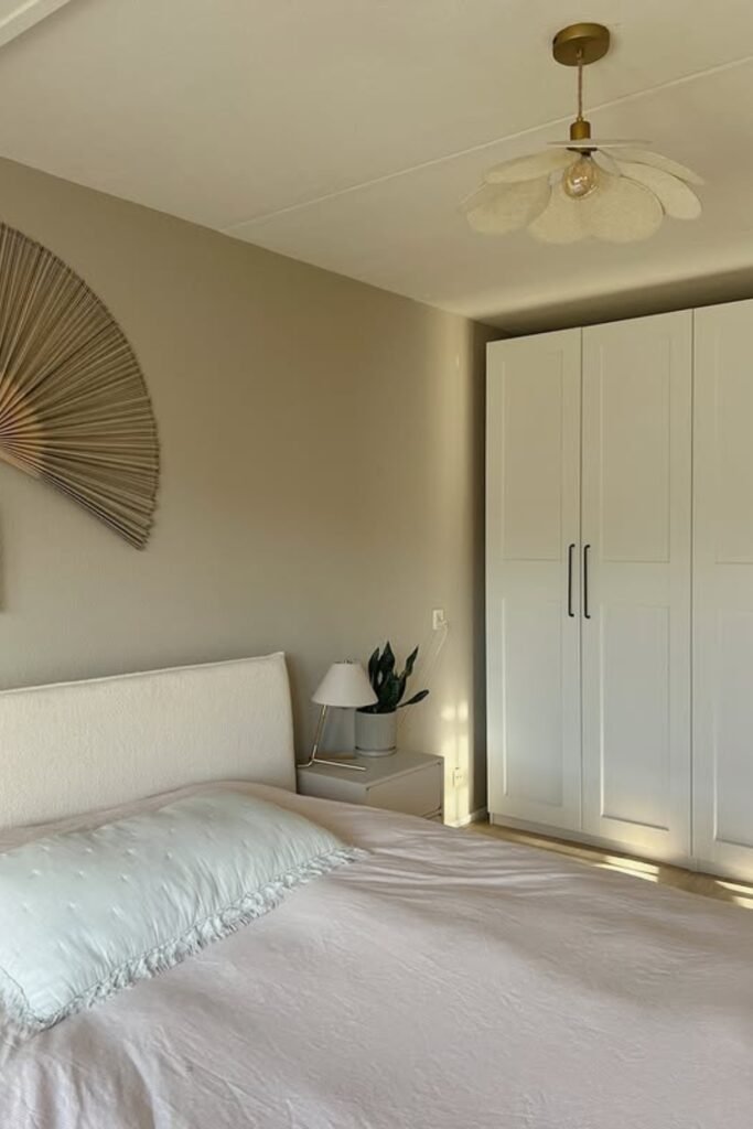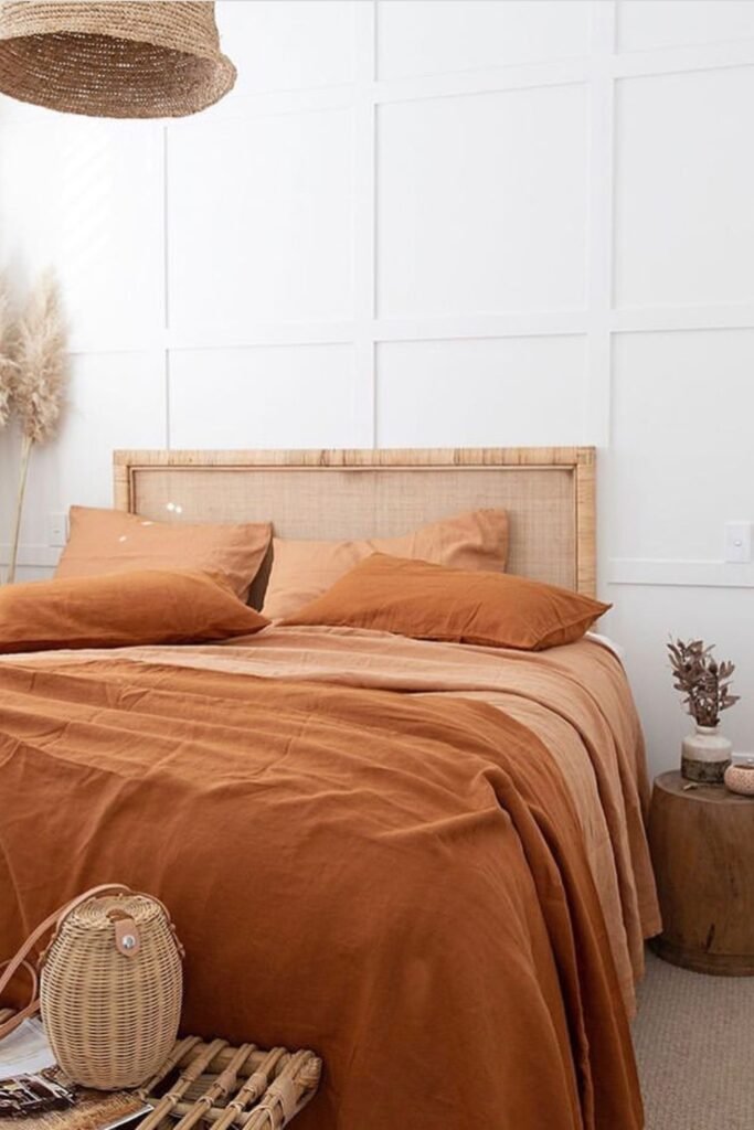 You get support from a solid headboard against a clean wall, while warm, earthy tones help you feel grounded instead of stuck in a sterile space.