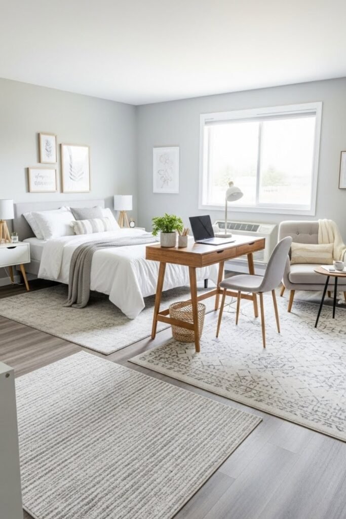 You should use rugs, lighting, or furniture placement to separate sleep from work or lounging. This setup works especially well in apartments where one room has to do more than one job.