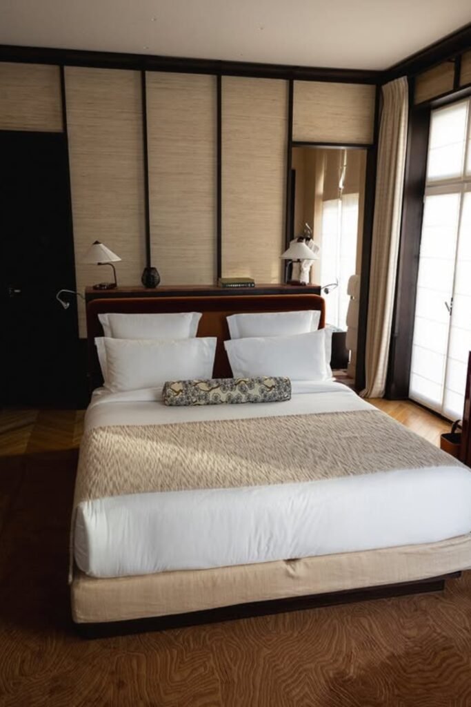 The tall panels or a deep headboard create a cocoon effect that blocks visual noise and anchors the bed.