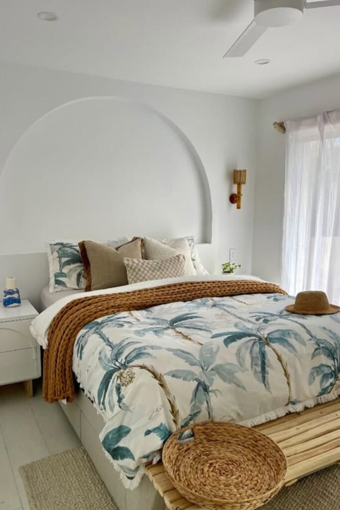 If your bedroom feels boxy or harsh, you can add a curved headboard, arch detail, or even an arched paint shape behind the bed.