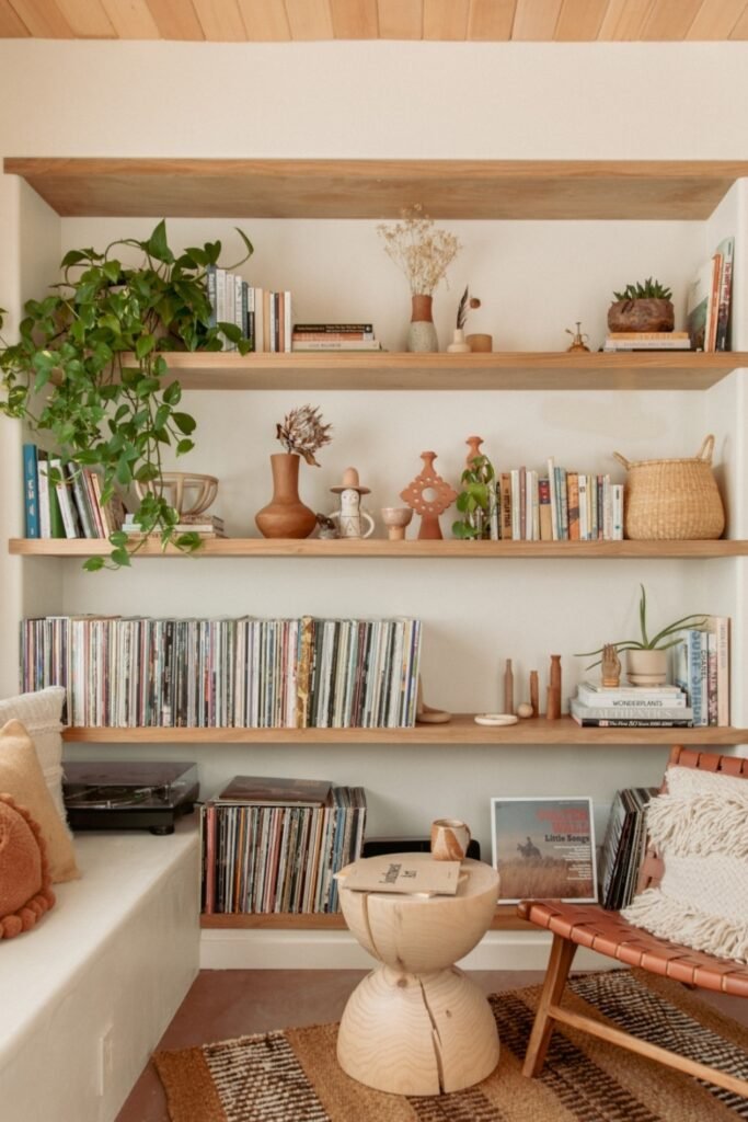 You can pair warm wood shelves with vintage finds, small plants, and muted accessories to create a relaxed, homely corner.