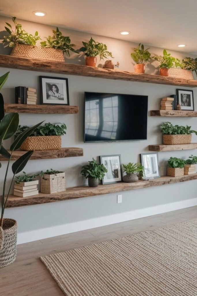 If you want your TV wall to feel alive, layered wooden shelves filled with trailing plants instantly transform the space.