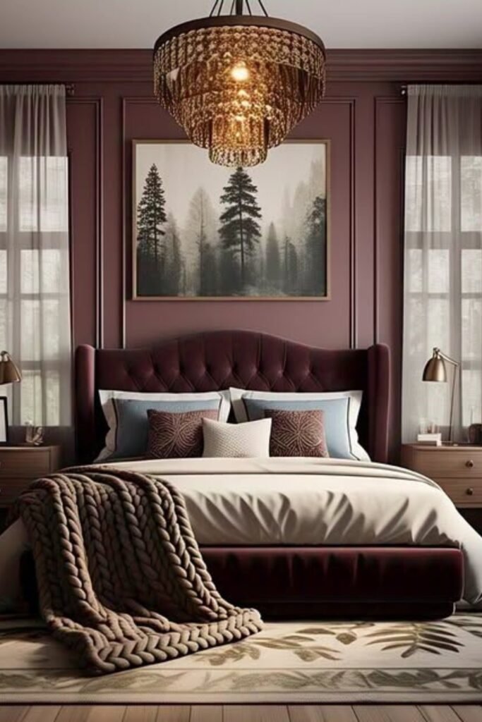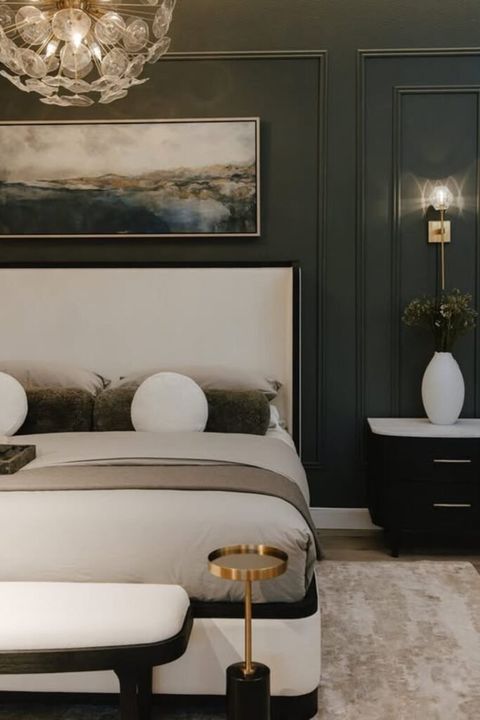 You should balance the deep shade with lighter bedding and soft gray curtains so the room doesn’t feel too dark. You can add warm metals like brass through lighting for extra depth.