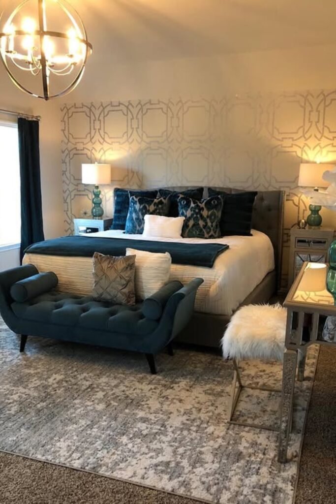 If you recreate this, use textured or metallic wallpaper behind the bed and layer darker tones in pillows or a bench.