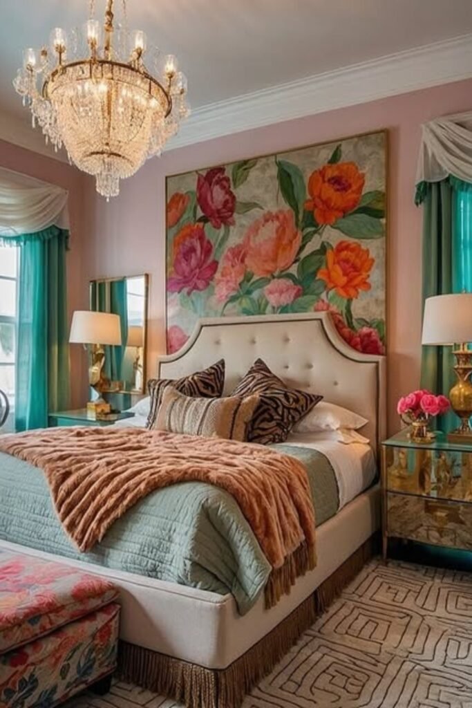 When you add oversized floral artwork, it instantly sets the mood, while blush walls and emerald curtains make colors intentional, not random.