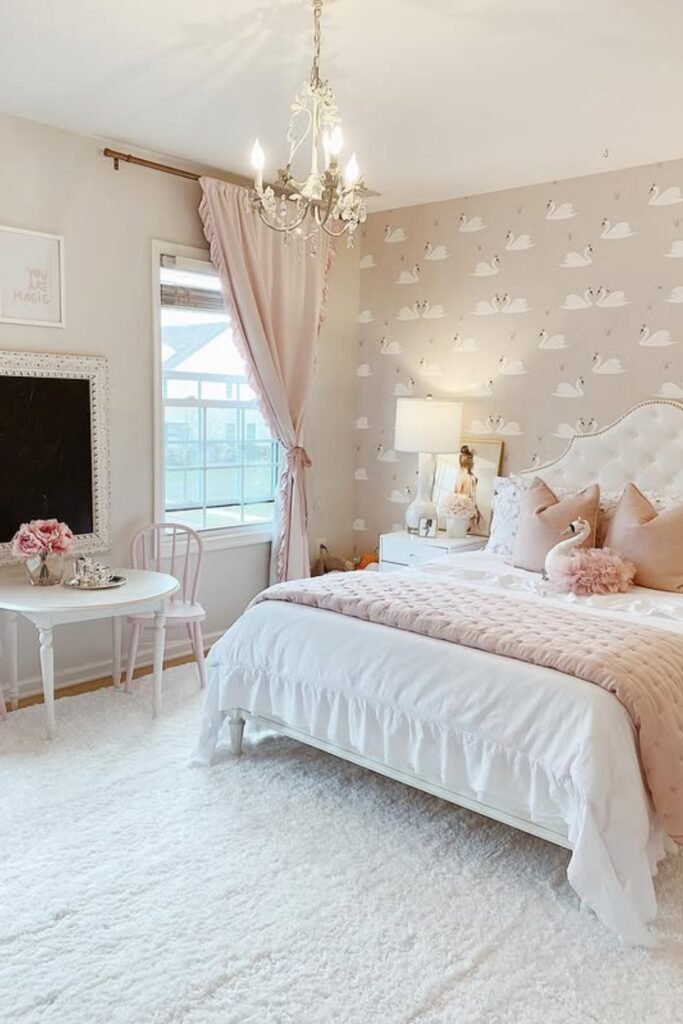 When you add swan wallpaper, you can give the room personality without overpowering it, while a crystal chandelier keeps everything elegant.