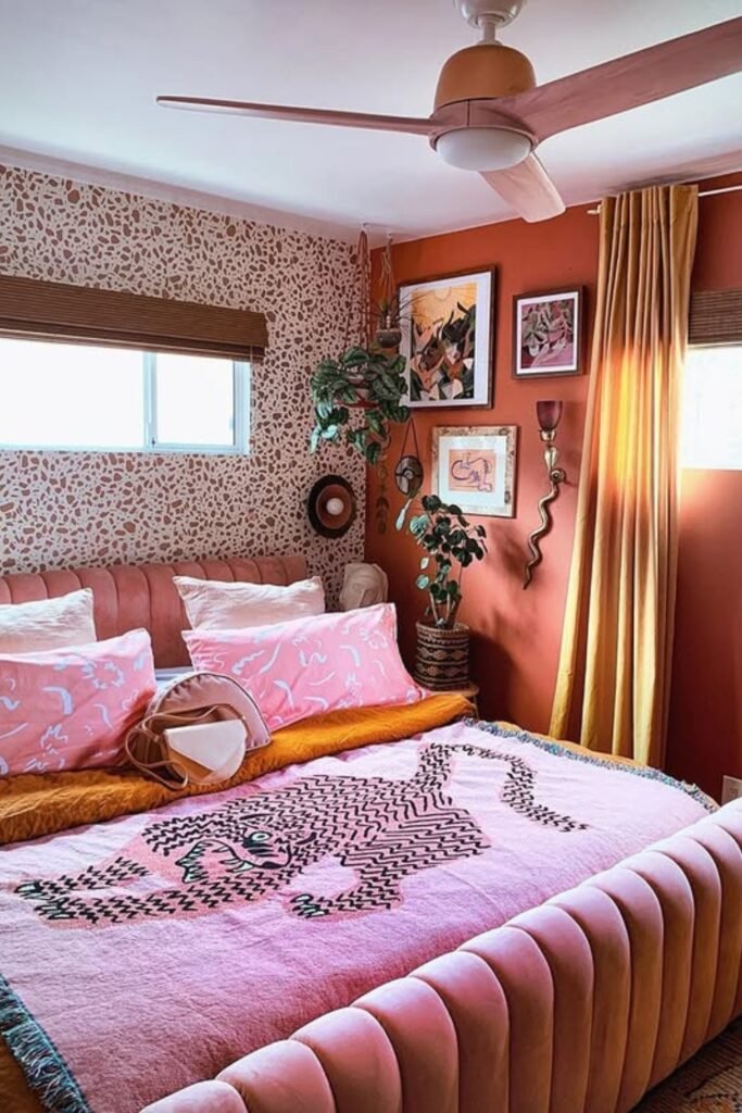 You should repeat pink, rust, and mustard tones across pillows, curtains, and artwork so it feels intentional.
