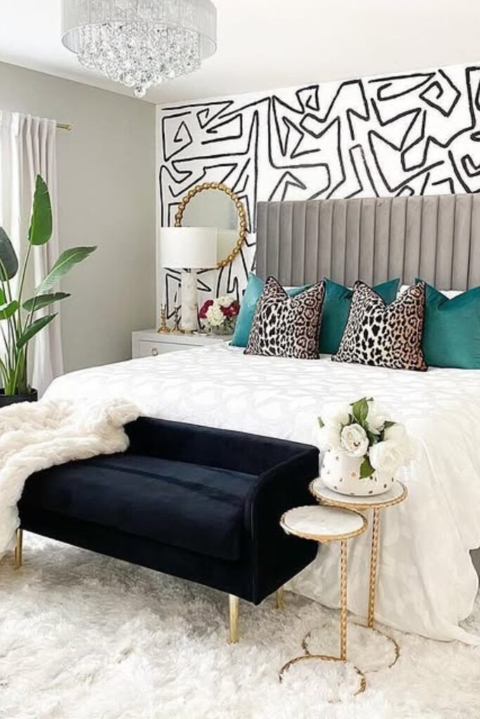You will notice how pattern can feel glam when you anchor it correctly. You might use a bold black-and-white mural for energy, while a tall upholstered headboard keeps the room grounded.