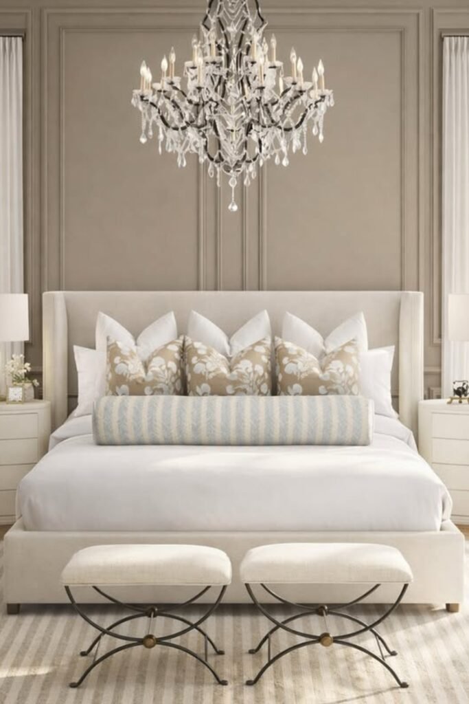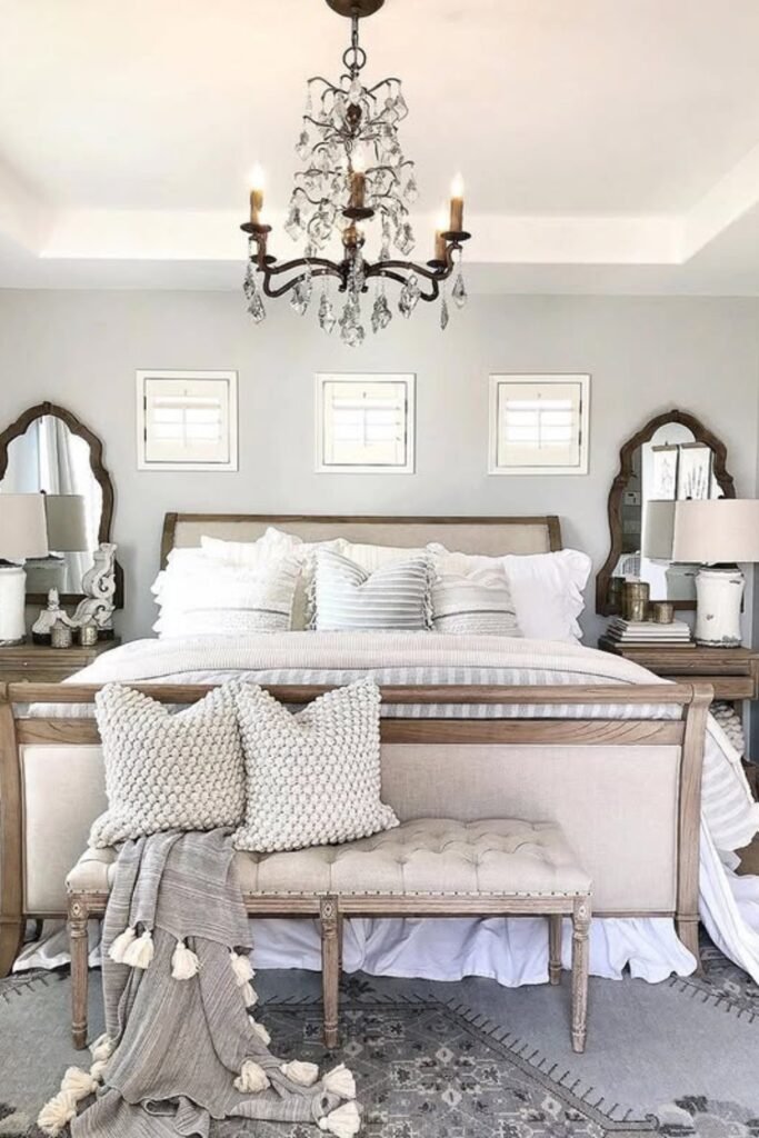 You can add carved mirrors and classic lighting for elegance, while layering neutral bedding keeps the room relaxed.
