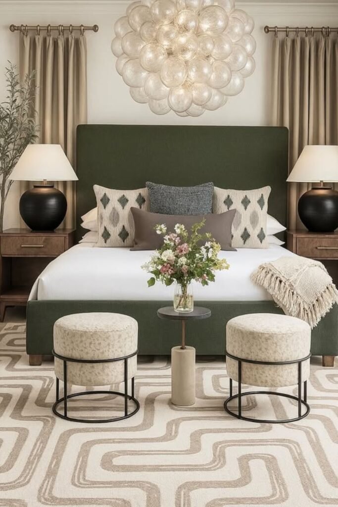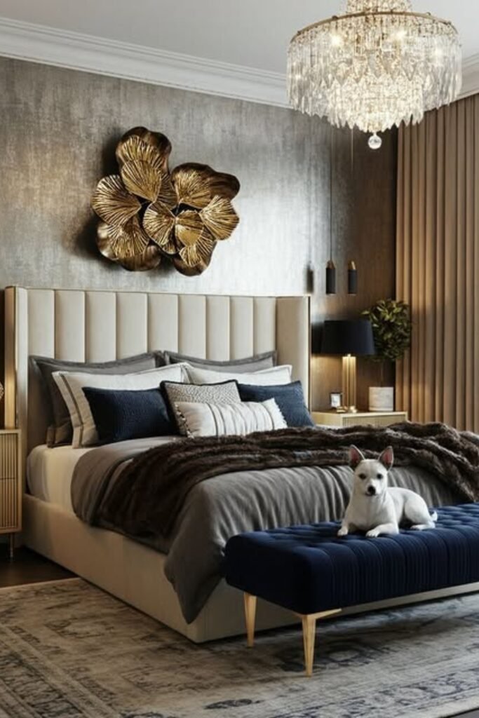If you follow this order, statement bed, controlled shine, rich textures, and layered lighting, you will create glam without making it look cheap or overdone.