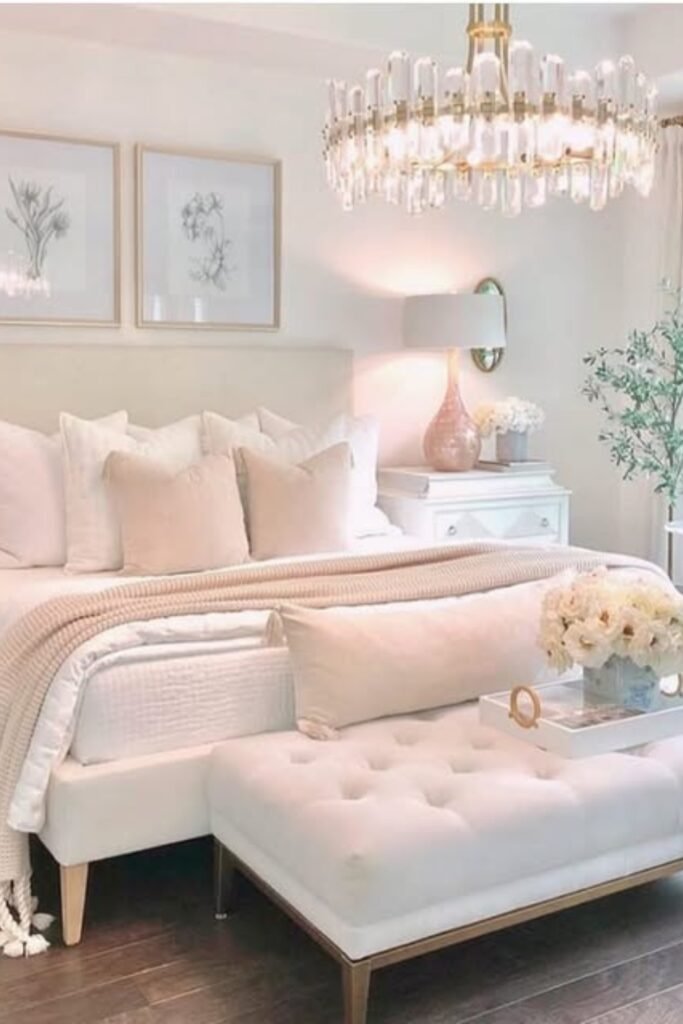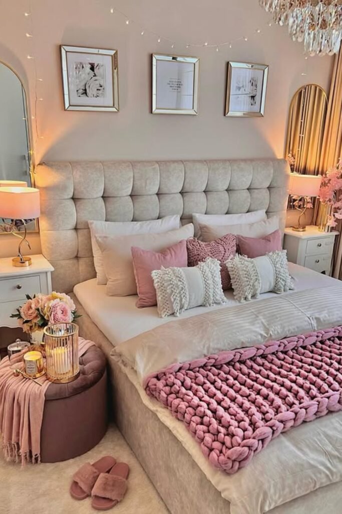 You can use string lights, warm lamps, and blush tones to make your bedroom feel intimate and inviting without losing glam.