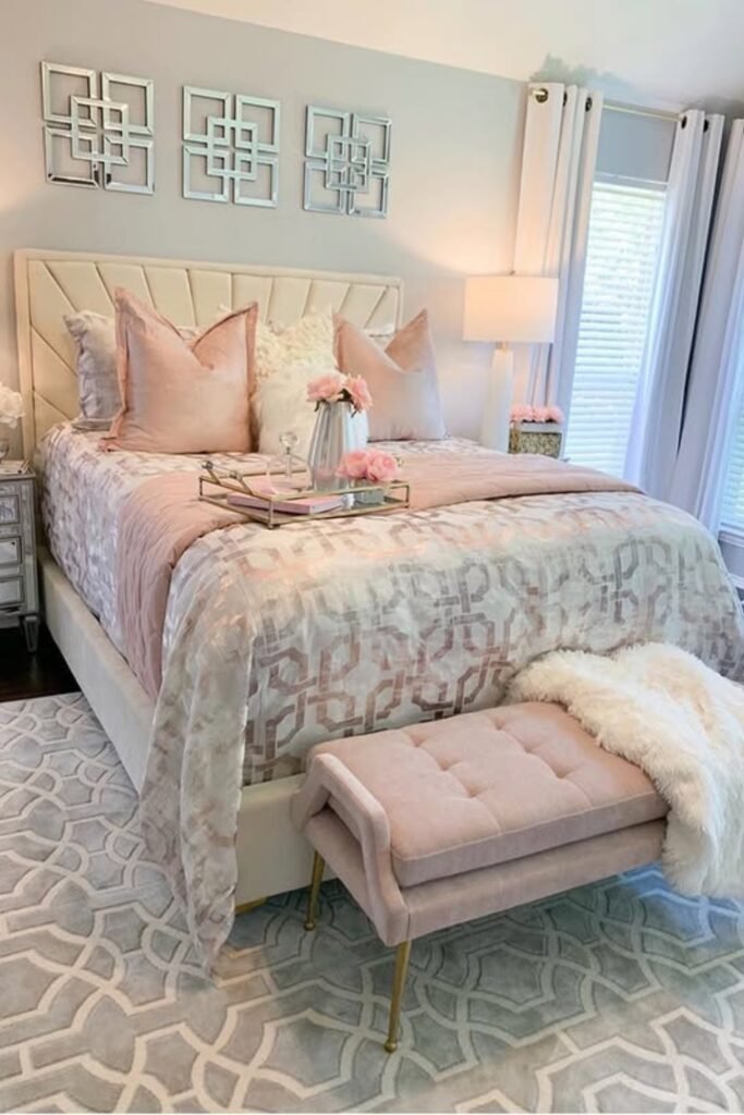 You can use a structured headboard, geometric bedding, and a mirrored nightstand to keep your space polished without it feeling overly sweet.