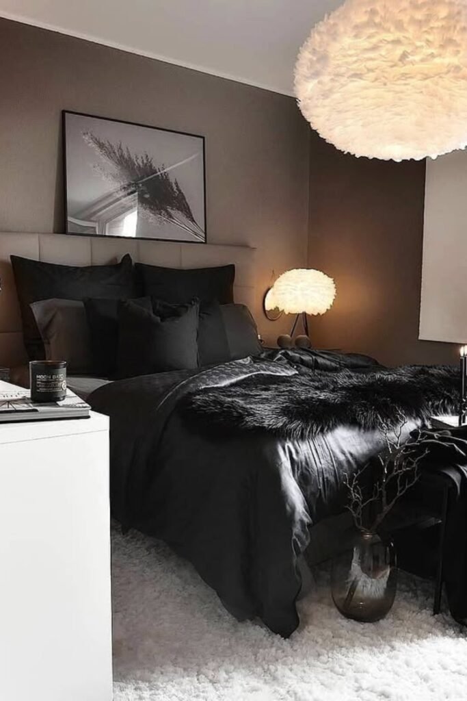 You can use black bedding, charcoal pillows, and a sleek bench to create depth instead of heaviness.