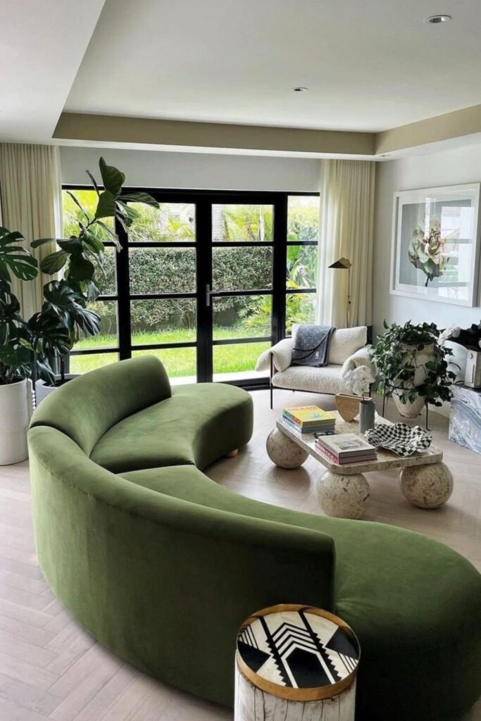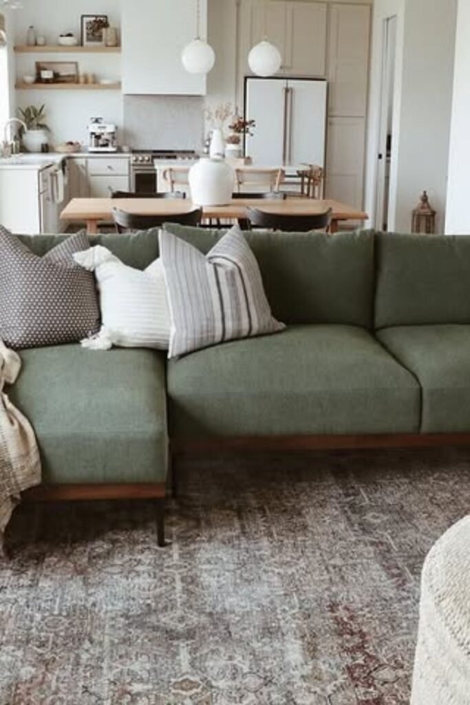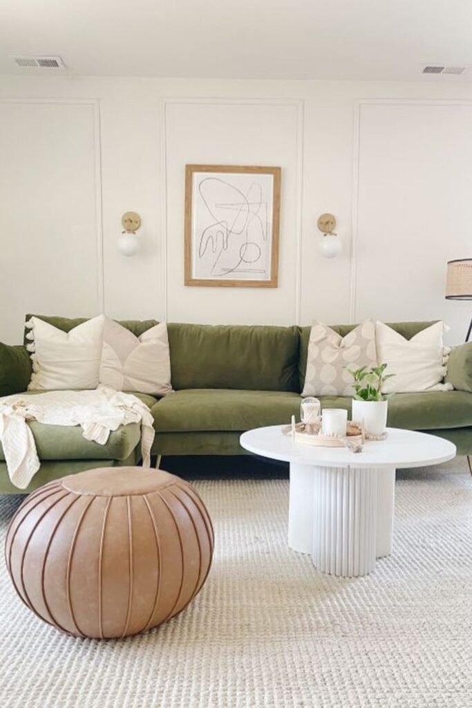 You don’t need loud colors to make your green sofa shine. Add an olive-green sectional anchoring your space while off-white walls keep things light.