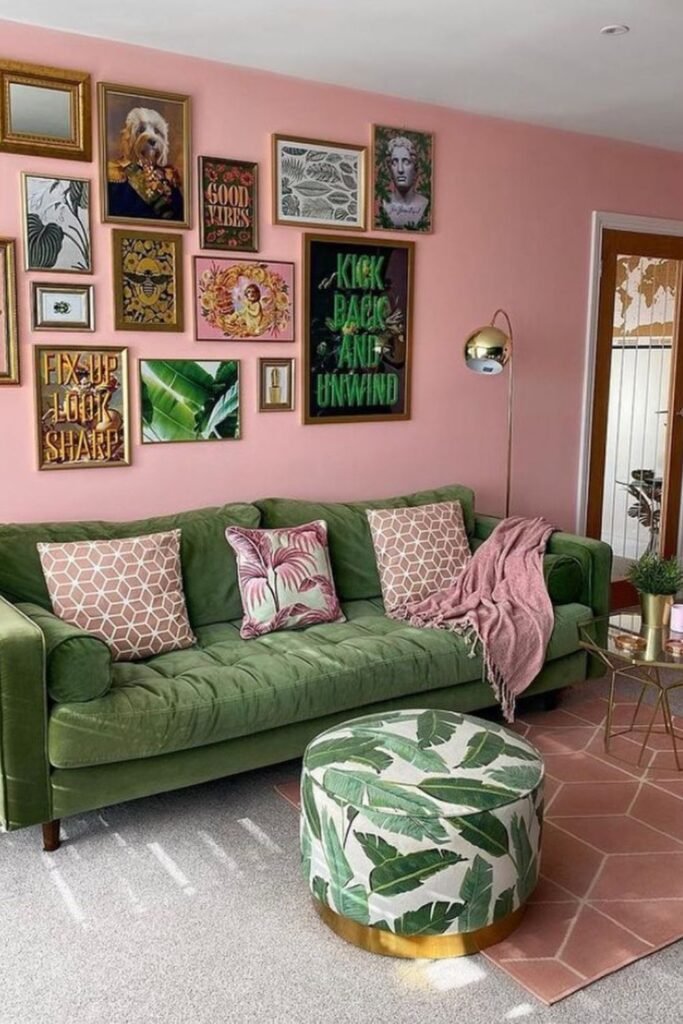 You can create a space that blends bold personality with everyday comfort, your light green sofa as a playful base, while a gallery wall above instantly adds character.