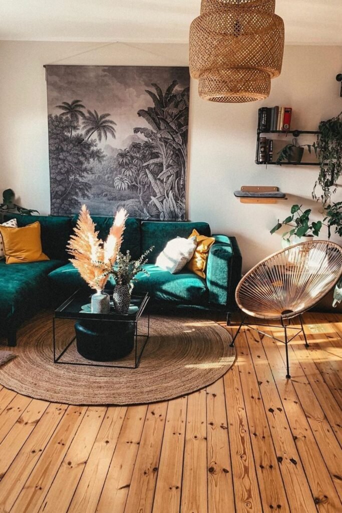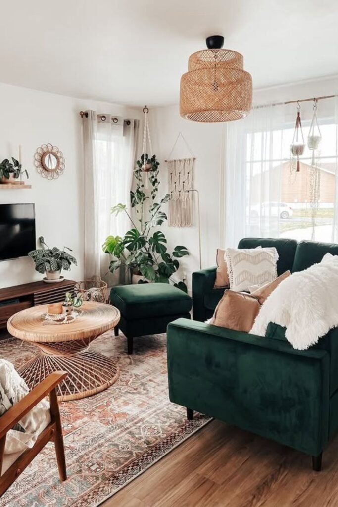 You can balance bold and soft easily and let your deep green sofa anchor the room while woven textures in tables, lights, and décor add warmth.