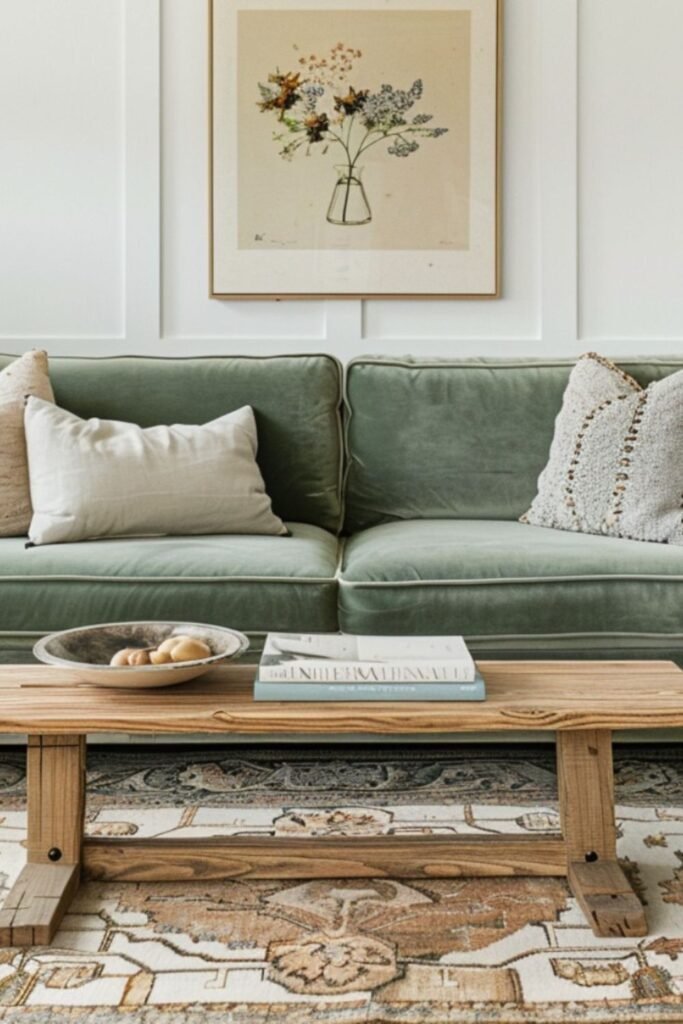 A dark green sofa gives you a bold focal point, while sage or olive softens the room. If your living room doesn’t get much sunlight, you will want lighter shades so it doesn’t feel heavy.