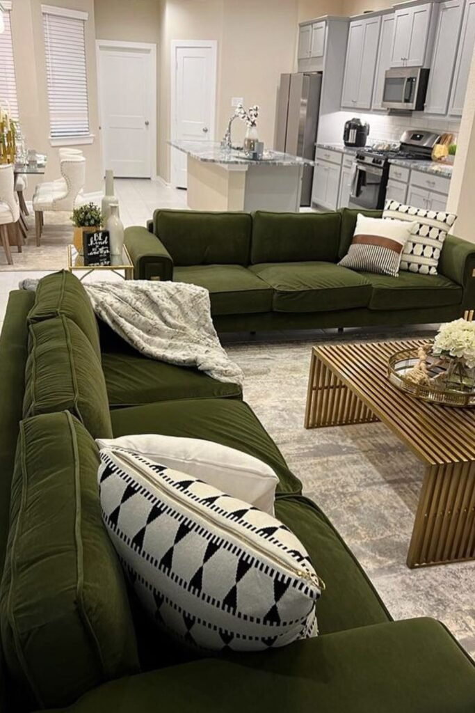 If you want your sofa to anchor the space, deep green is perfect. You can pair it with warm wood and soft lighting to make the room feel inviting.