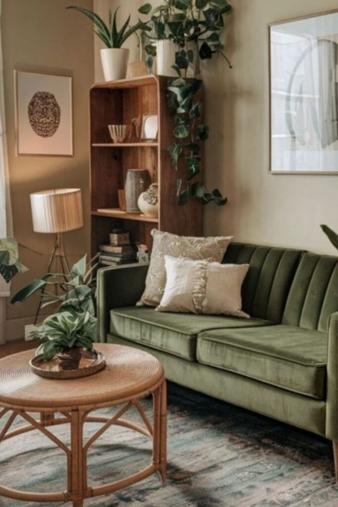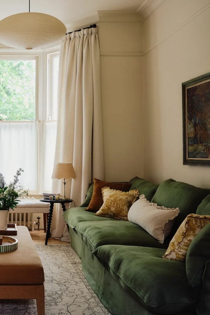 You will see green can feel light and cozy at the same time and keep soft white walls and layered pillows so your sofa has space to breathe.