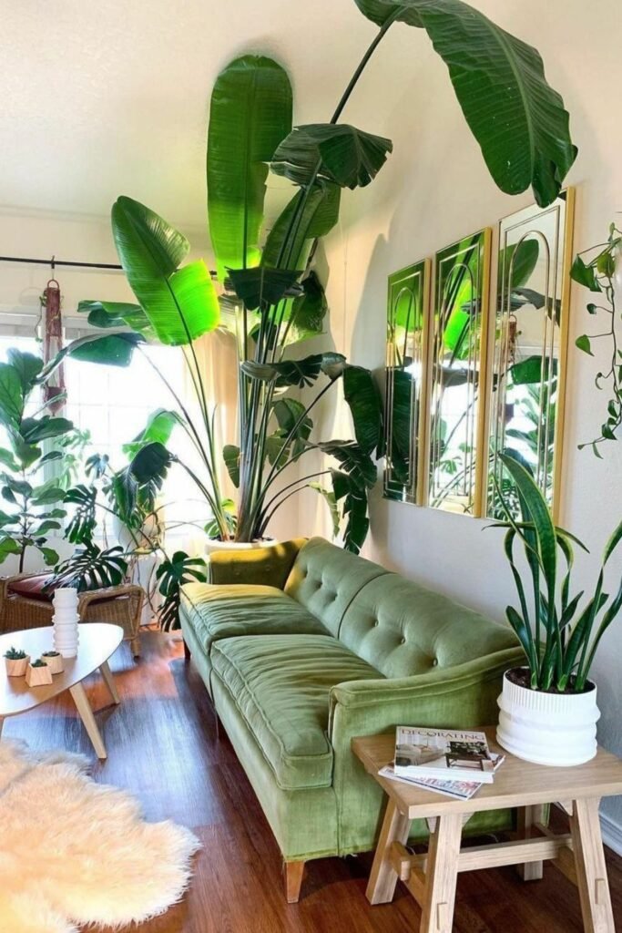You can mix tall statement plants with soft rugs and light wood tables to keep your look natural and airy.