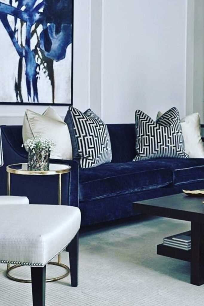You can picture a sophisticated living room with a deep blue sofa paired with crisp white seating and bold patterned cushions.