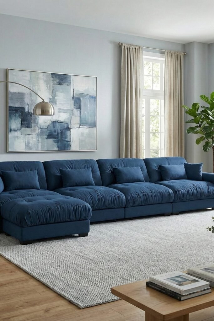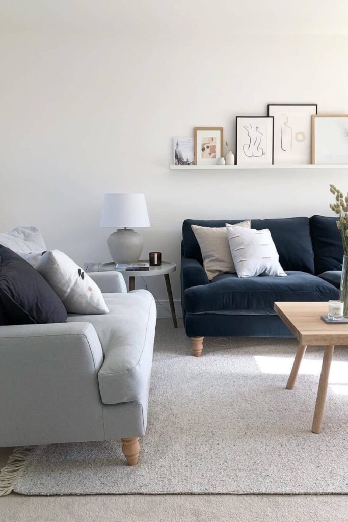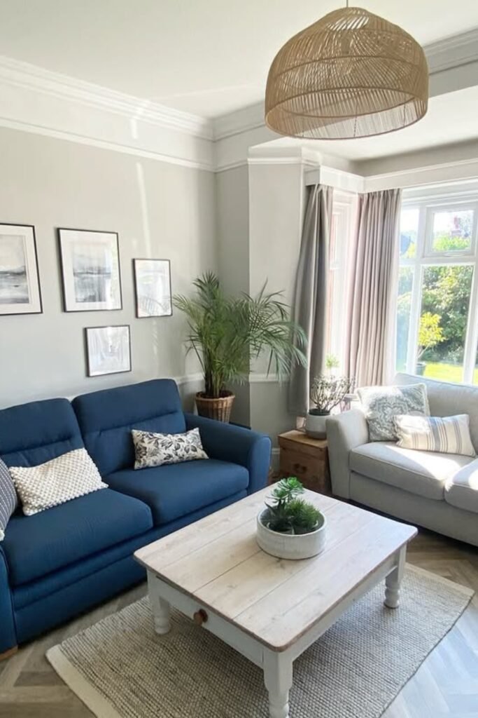 You can picture a clean and minimal living space where soft neutral tones pair with a deep blue sofa just for contrast.