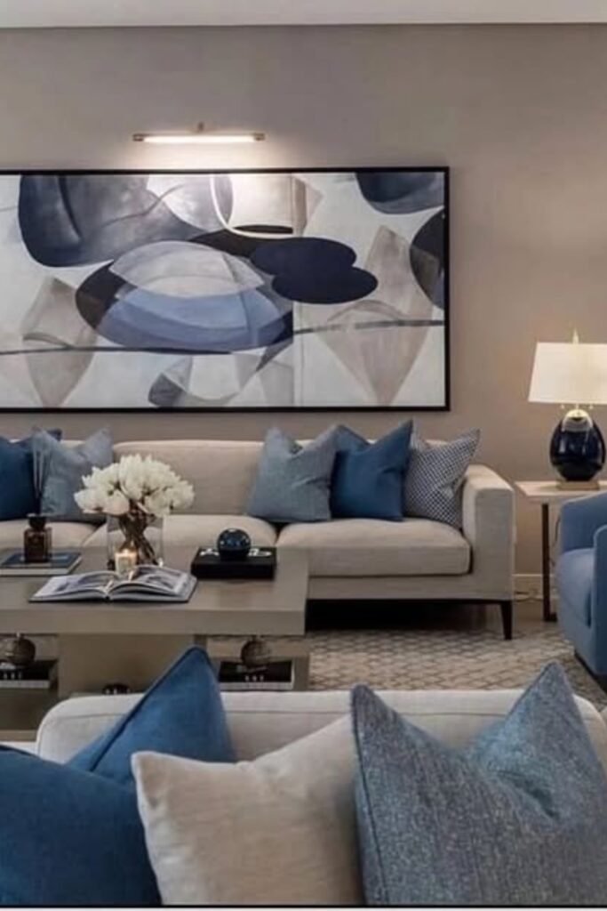 You can picture a polished living room where soft neutrals blend with layered blue accents just for you.