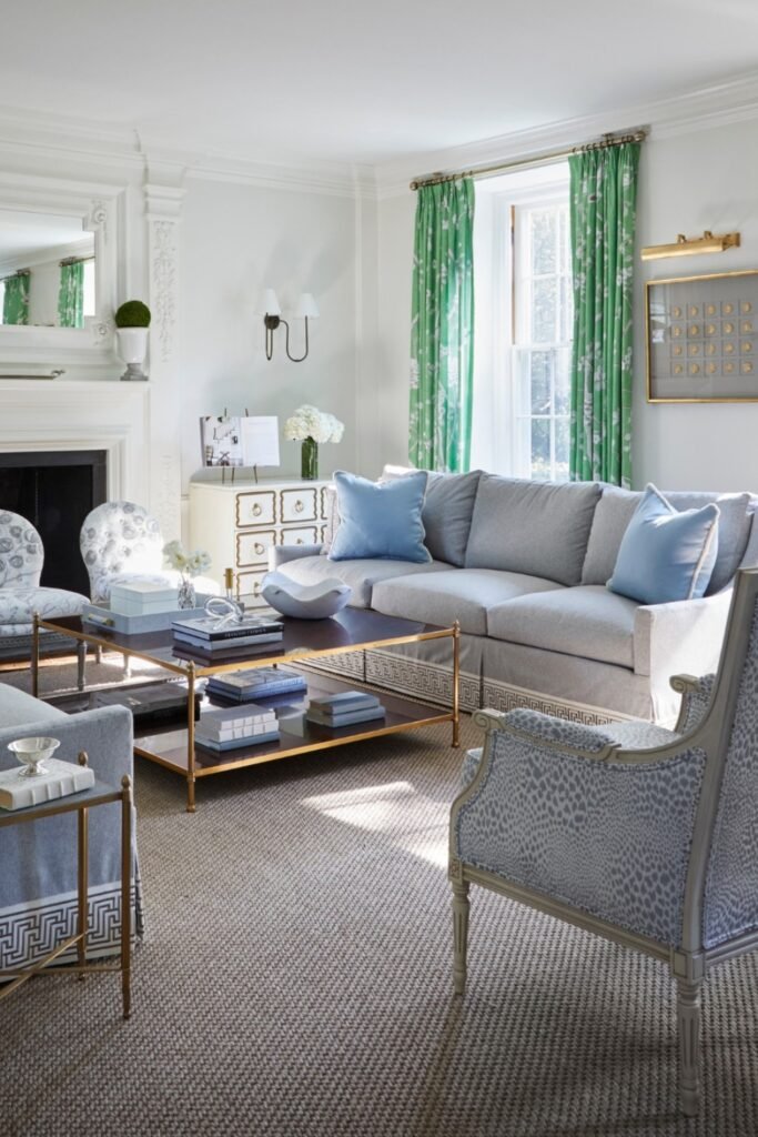 When you enter a timeless living room with soft neutrals accented by light blue and fresh green curtains, you’ll immediately feel welcomed.
