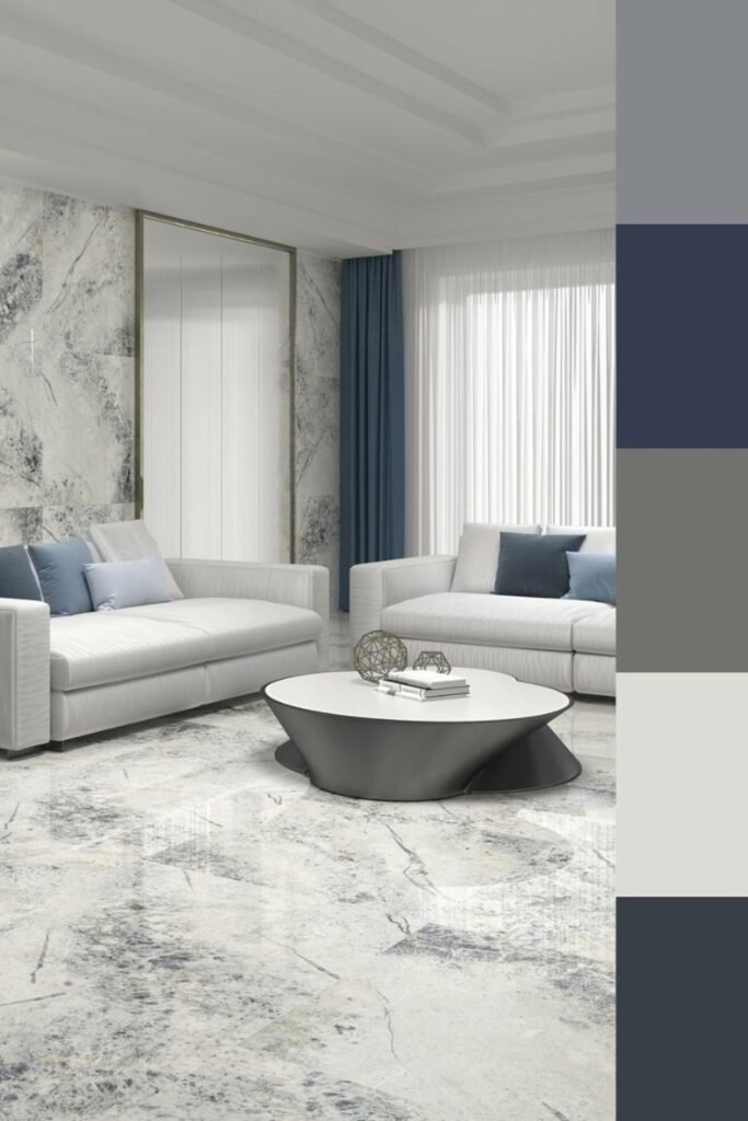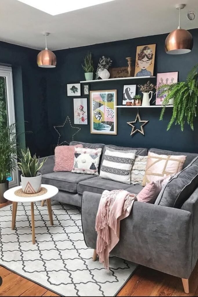 If you want a safe, timeless look, you can keep grey as your base, on your walls or your sofa, and you can bring blue in through cushions, art, or a rug.