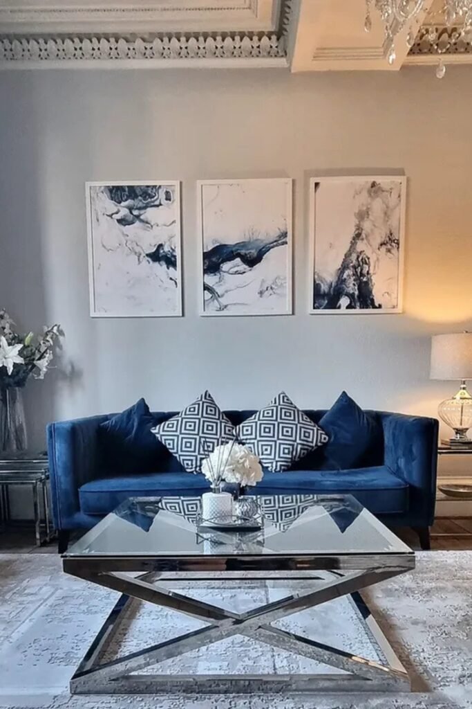 You can imagine a refined living space where a deep blue sofa takes center stage and makes you feel at home.