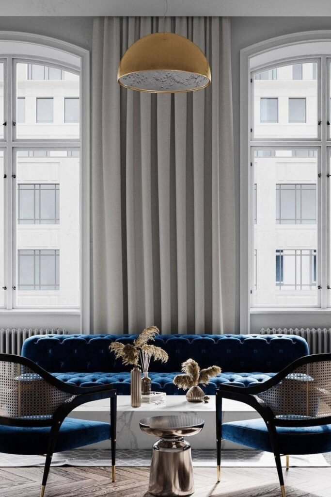When you enter a refined space with a deep blue tufted sofa and matching accent chairs, you’ll see how soft neutral curtains and abundant natural light keep you calm.