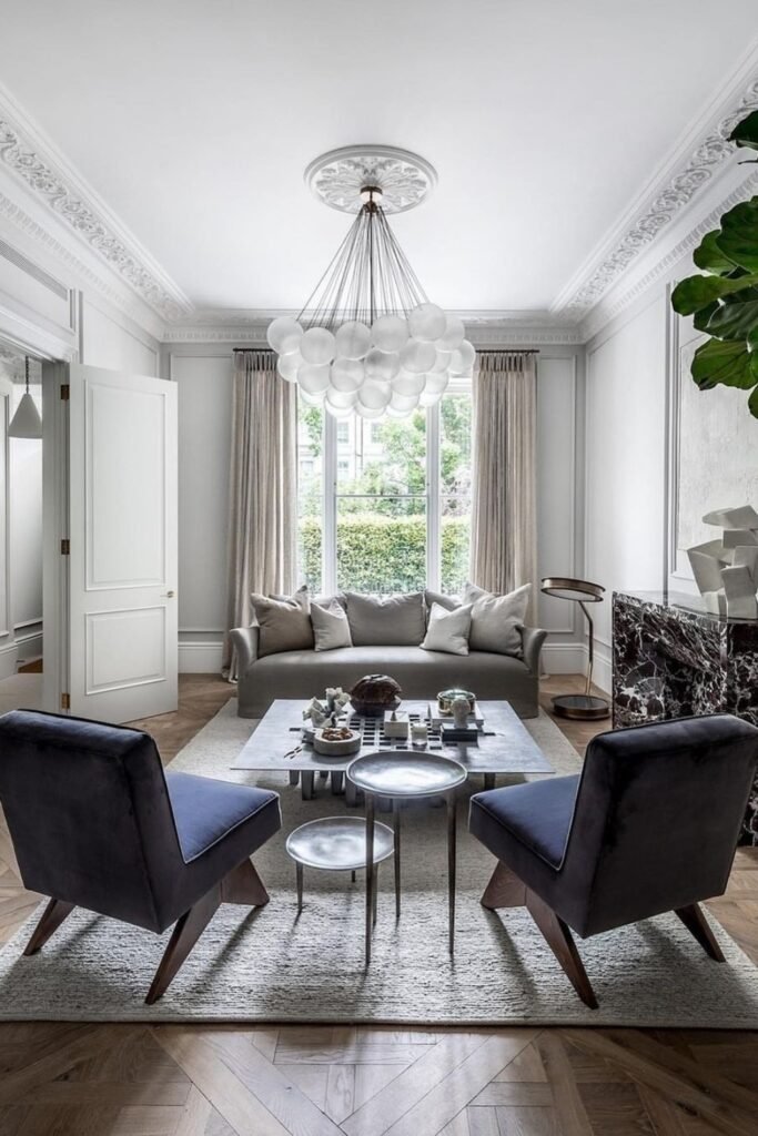 You might step into a refined living room blending classic architectural details with modern furnishings.